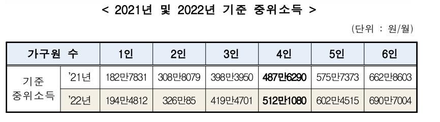 (중위30%)'21년 54만8349 92만6424 119만5185 146만2887 172만7212 198만8581 '22년 58만3444 97만8026 125만8410 153만6324 180만7355 207만2101 생계급여 1인가구 35,095원 인상 2인가구 51,602원 인상