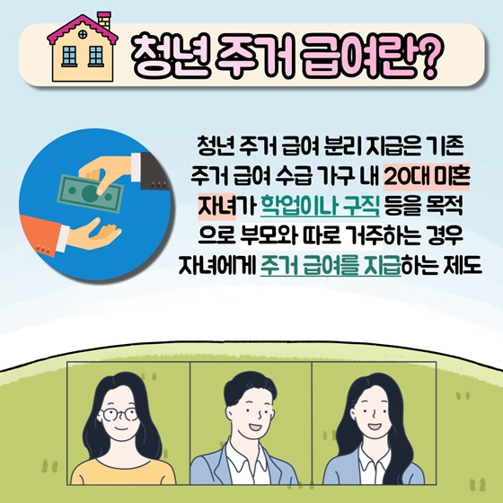 지원대상 :1.주거급여 받는 수급가구 내 만 19세 이상 30세 미만 미혼청년 2.중위소득 45%이하인 가구 3. 청년명의 임대차계약으로 임차료 지불하는 경우(전입신고 필수) 4. 부모와 청년이 주민등록상 시.군을 달리하는 경우 인정하지만 동일 시,군이라 하더라도 보장기관이 인정하는 경우 예외