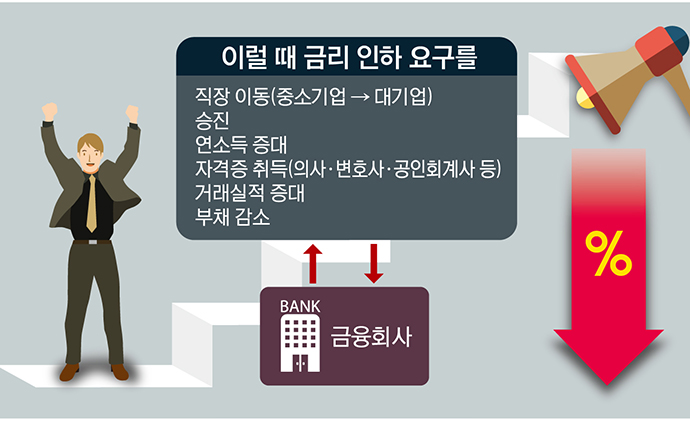 금리인하요구는 어떤 경우에 신청할 수 있느냐 하면,대표적으로 소득과 재산 증가가 해당되는데 사업이 잘 되어 수입 늘어났거나,직장에서의 승진 또는 이직하여 많은 월급 받게 되었다면 금리인하 청구할 수 있고 (직장변동,연소득변동.직위변동, 전문직자격증 취득, 거래실적 변동, 신용등급 개선,자산증가, 부채감소) 전문자격증 취득했을 때에도 신청할 수 있습니다.사실 지금까지의 금리인하요구권은 신청자는 많지만,심사 기준 까다롭고 금융기관에서 승인하는 건수 적어 쓸모 없는 권리라고 말할 정도로 불만이 높았습니다. 정부에서 2022년부터 금융소비자 보호 위해 금리인하요구권 확대하면서 이전까지 까다로웠던 신청기준과 심사절차 완화시켜 앞으로는 신용상태 개선된 사람은 누구든 신청할 수 있도록 각 금융기관의 신청기준 통일하고 또 신청 사유도 여러 항목으로 나눠서 사람들이 어떤 경우 신청할 수 있는지 쉽게 이해할 수 있도록 안내지 마련한다고 합니다.