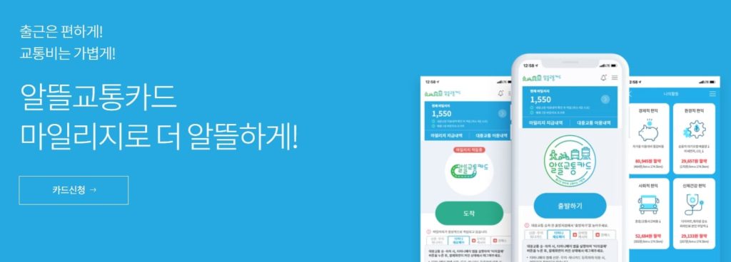 모바일 알뜰교통카드 추진 중으로 2022년 6월 현재 159개 시군구에서 시행하고 있으며,이용자 수 '2021년 29.0만 명에서 2022년 6월 현재 39.7만 명으로 대폭 증가한 상황입니다.알뜰교통카드 사용 시 이용자는 대중교통 이용 시 정류장과 출.도착지 간 보행.자전거 등을 통해 이동한 거리 최대 800m에 따라 국가와 지자체가 20%의 마일리지 지급하고,카드 이용실적에 따른 카드사의 10% 추가지원으로 대중교통비 최대 30%까지 절감할 수 있습니다.