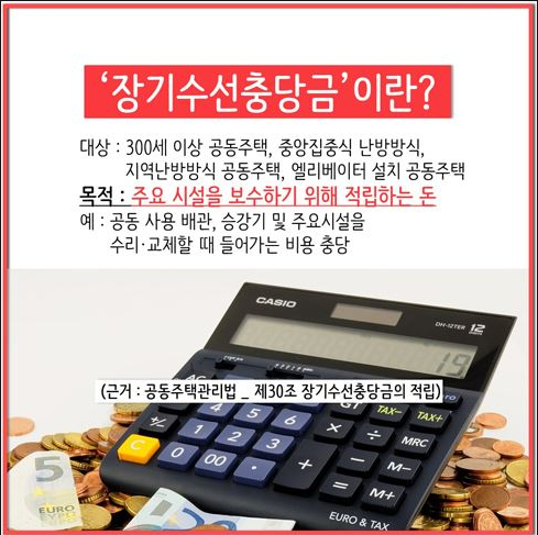 매월 받는 관리비 고지서 자세히 보면 관리비, 청소비, 소독비 등 여러 항목이 있는데 고지서 중간쯤 장기수선충당금이라는 조금 생소한 항목이 있을 거예요. 장기수선충당금은 아파트나, 오피스텔, 원룸에 거주하면 보이는 항목으로 장기수선충담금이 무엇이냐 하면 아파트나 오피스텔의 경우 건물 노후에 대비해 오래된 외벽 도색, 배관수리,승강비 보수에 쓸 비용을 "매달 관리비로 장기간 쌓아 놓는 금액"이라 생각하면 되는데, 장기수선충당금은 주택의 소유자 그러니까 집주인이 부담해야 하는 돈으로 원래는 집주인이 내는 돈이지만, 다만 편의상 관리비에 포함되어 세입자가 내는 것이 하나의 관습이 되어 버린 현실. 현재 월세나 전세 살고있어, 현재 그 집에 거주하고 있다는 이유로 매달 내고 있는 금액으로 장기수선충당금은 따로 뺄 수도 없으며, 나중에 임대차계약 끝났을 때 즉, 이사갈 때 그 동안 내가 냈던 충당금 모두 되돌려 받을 수 있어요.그렇게 따지면 이 금액도 적지는 않겠죠. 많게는 몇 만원 낼 수도 있고 적게는 몇 천원 단위인데, 이게 매달 쌓이고 쌓이면 나중에 그 금액도 엄청나게 커진다는 사실. 그래서 반드시 이사갈 때 집주인에게 청구하면 받을 수 있는데, 깜박하고 챙기지 못했다 해도 주택법에 따라서 10년 내에 집주인에게 청구하면 되돌려 받을 수 있으니까 몰라서 못 챙겼다면 지금이라도 꼭! 돌려 받으세요. 임대차계약서에 "장기수선충당금은 임차인이 부담"한다는 특약 있을시 충당금 반환 어려울 수 있으므로 계약서 체크하는 것 기억해 주세요.