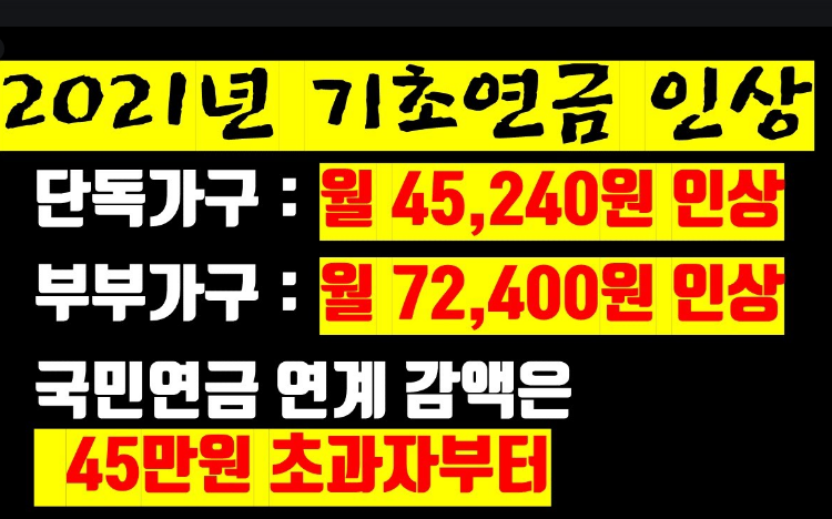 2019년 4월부터 기초연금 수급자 가운데 65세 이상 소득 하위 20% 기초연금 월 최대 30만 원으로 인상되며, 최대 30만 원의 기초연금액은 국민연금 수령액과 배우자 기초연금 수급 여부, 소득인정액 수준 등에 따라 일부 줄어들 수 있어요. 정부는 기초연금 지급액 ‘2020년 하위 40% 30만 원에서 2021년 하위 70% 30만 원’으로 확대할 계획이라고 합니다.